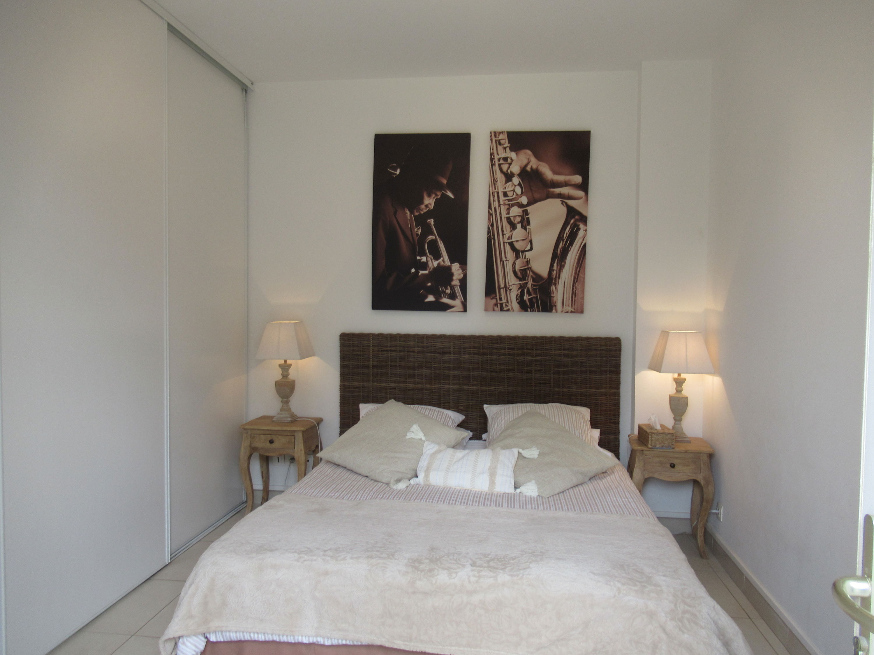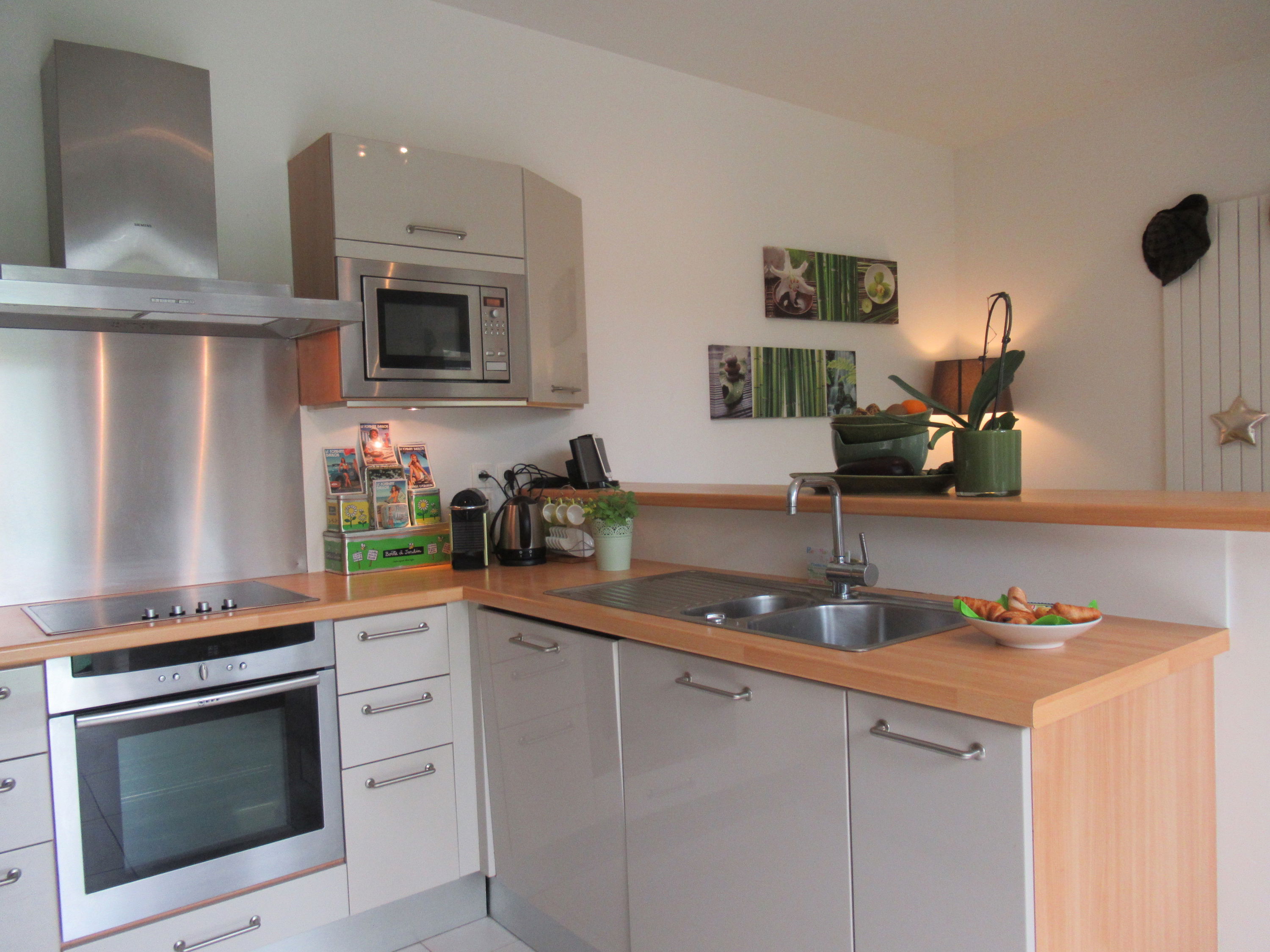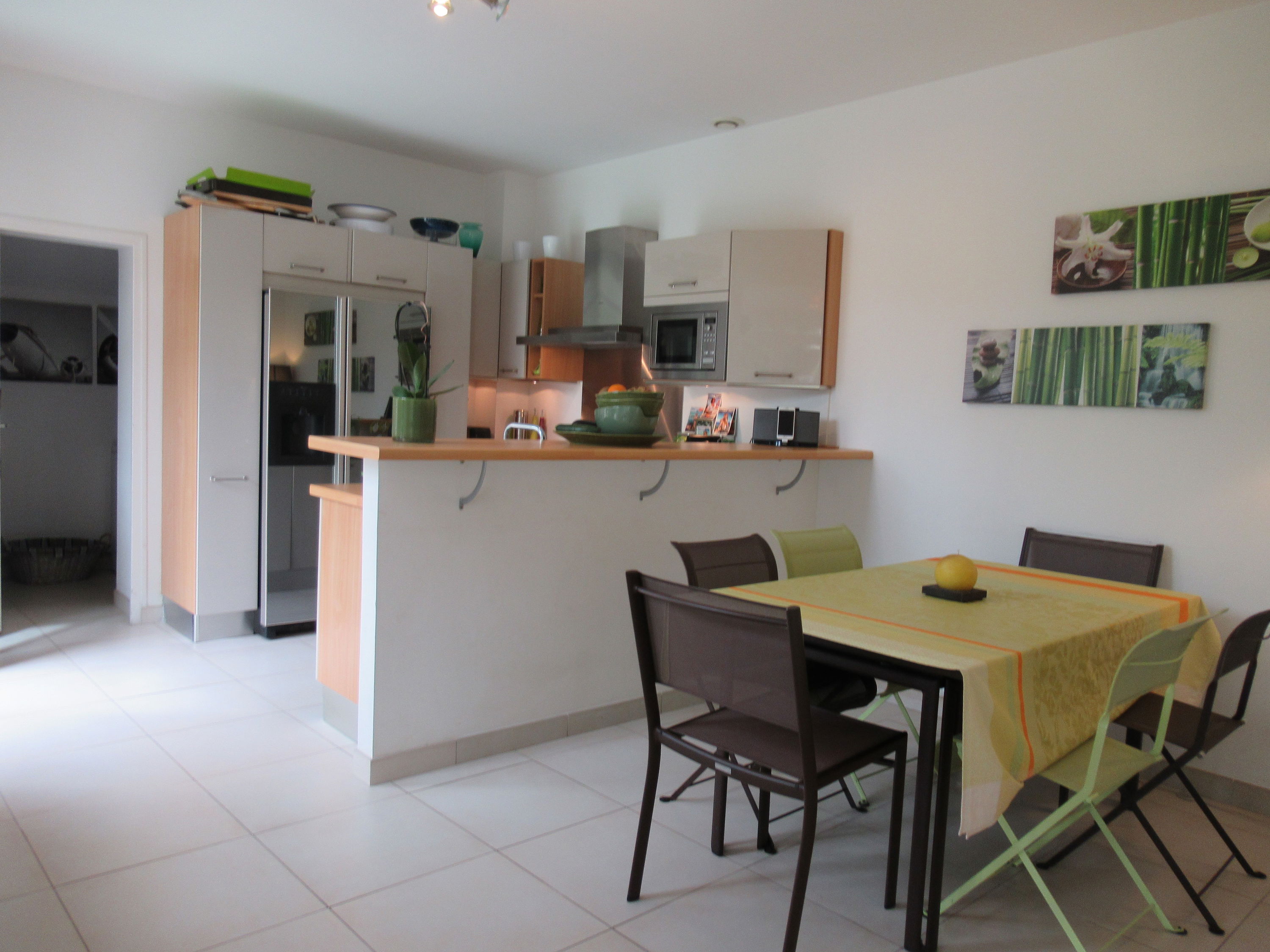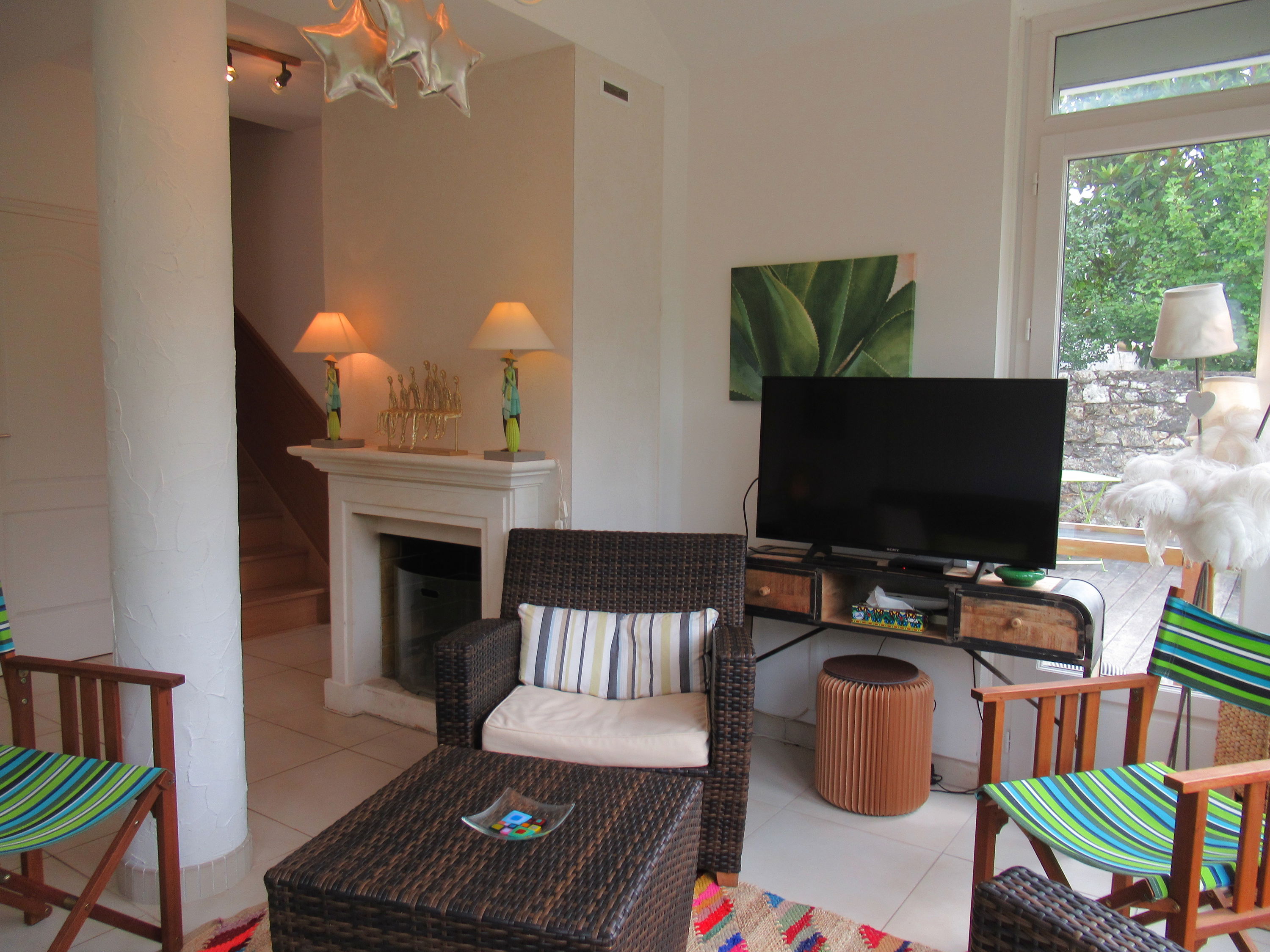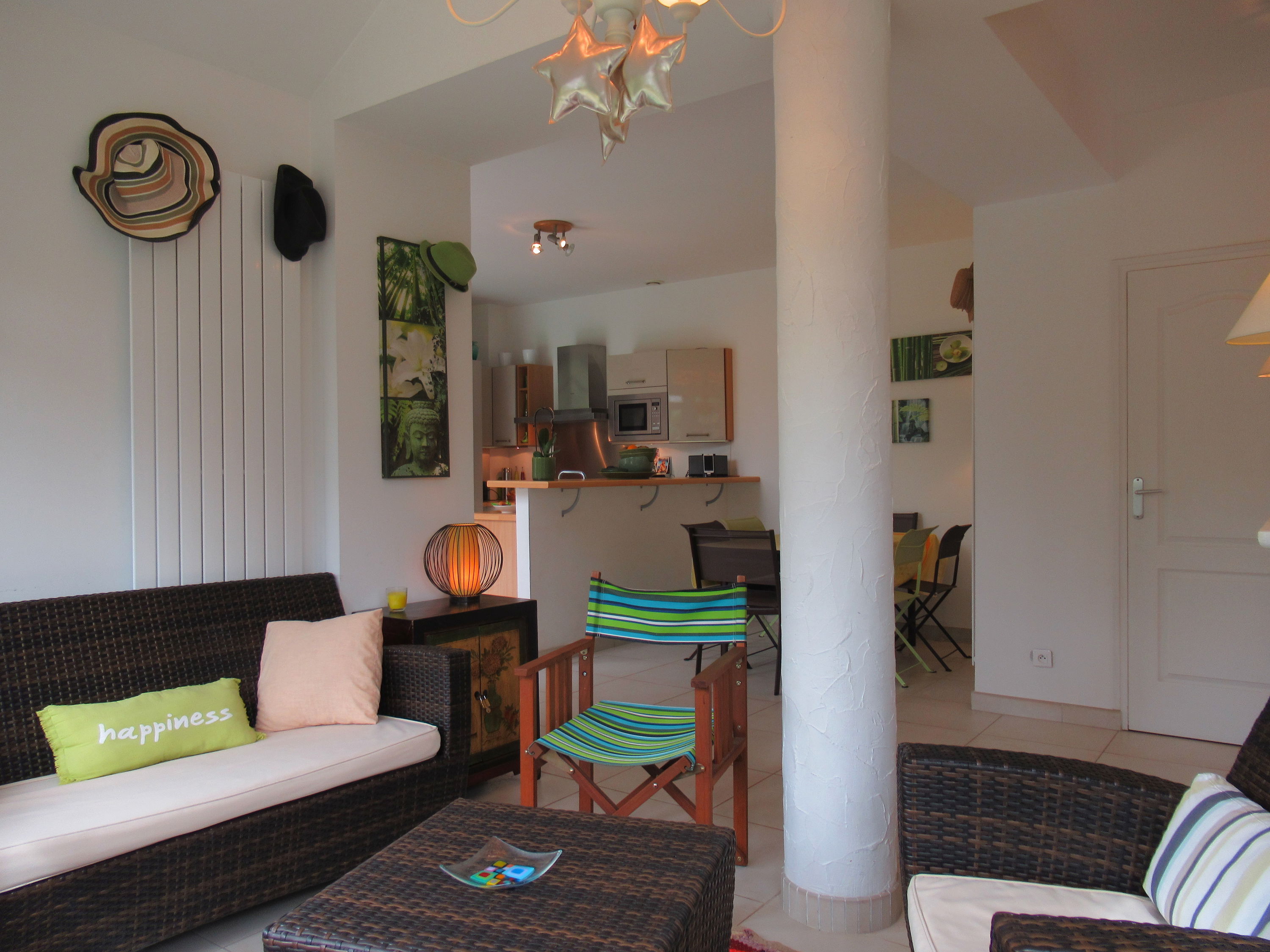 Schöne Familienvilla von 110 m² in der Nähe des Strandes von Benoit (300 m): Wohnzimmer von 50 m² (Tisch – 6 Stühle, Sofa, 2 Sessel, Fernseher) mit Erkerfenster mit Blick auf den Garten – Offene Küche A/E (Backofen – 4 Platten – Nespresso und Filter – Geschirrspüler – Toaster – Wasserkocher – Bose-Lautsprecher). Schlafzimmer 1 im Erdgeschoss mit Zugang zur Terrasse mit 160 cm breitem Bett + Schrank und Duschbad mit WC. Im Obergeschoss Schlafzimmer 2 mit Zugang zum Balkon mit 160-cm-Bett + Schrank und Duschbad mit WC - Schlafzimmer 3 mit Zugang zum Balkon mit 140-cm-Bett und Duschbad mit WC.
