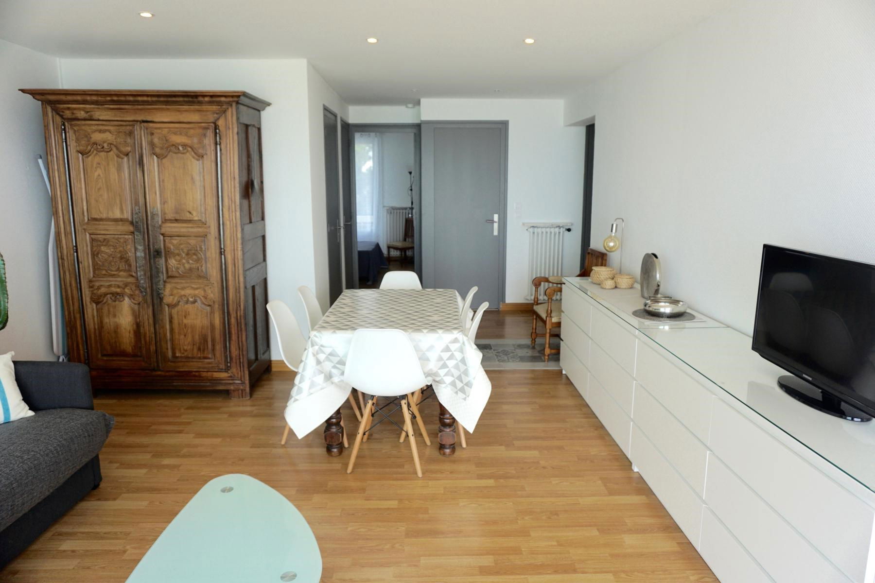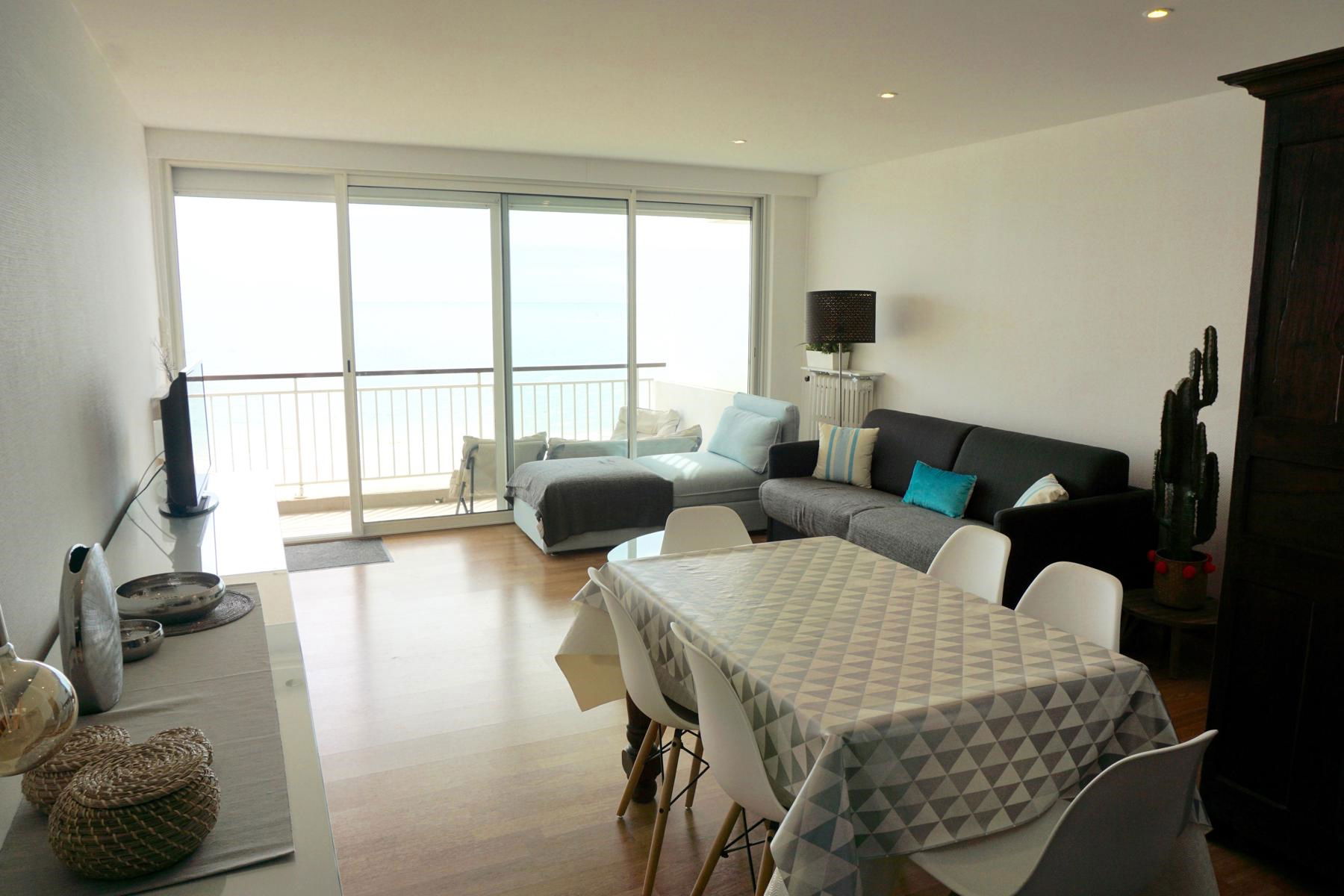 Im 4. Stock einer Residenz mit Blick auf das Meer bietet Ihnen diese 2-Zimmer-Wohnung alles zu Fuß für Ihren Urlaub. 200 m vom Markt oder der Avenue de Gaulle entfernt, umfasst es: Eingang - Schönes Wohnzimmer (Schlafsofa 160/190) mit Blick aufs Meer und Zugang zu einer Terrasse mit herrlicher Aussicht - Unabhängige Küche mit Kühl-/Gefrierschrank, Backofen, Gasherd + 1 Elektroherd , Dunstabzugshaube, Waschmaschine, kleiner Geschirrspüler, Mikrowelle - Schlafzimmer Nr. 1 mit 2 Betten 90/190 oder Doppelbett 180/190 + Schrank/Kleiderschrank, Zugang zum Nordbalkon - Duschbad mit italienischer Dusche - Schlafzimmer Nr. 2 mit 140/190 Bett + Schrank, Zugang zum Nordbalkon - Separates WC. Privater Parkplatz. Haustiere nicht erlaubt (Probleme mit Allergien). Registrierungsnummer: 44055000440FE