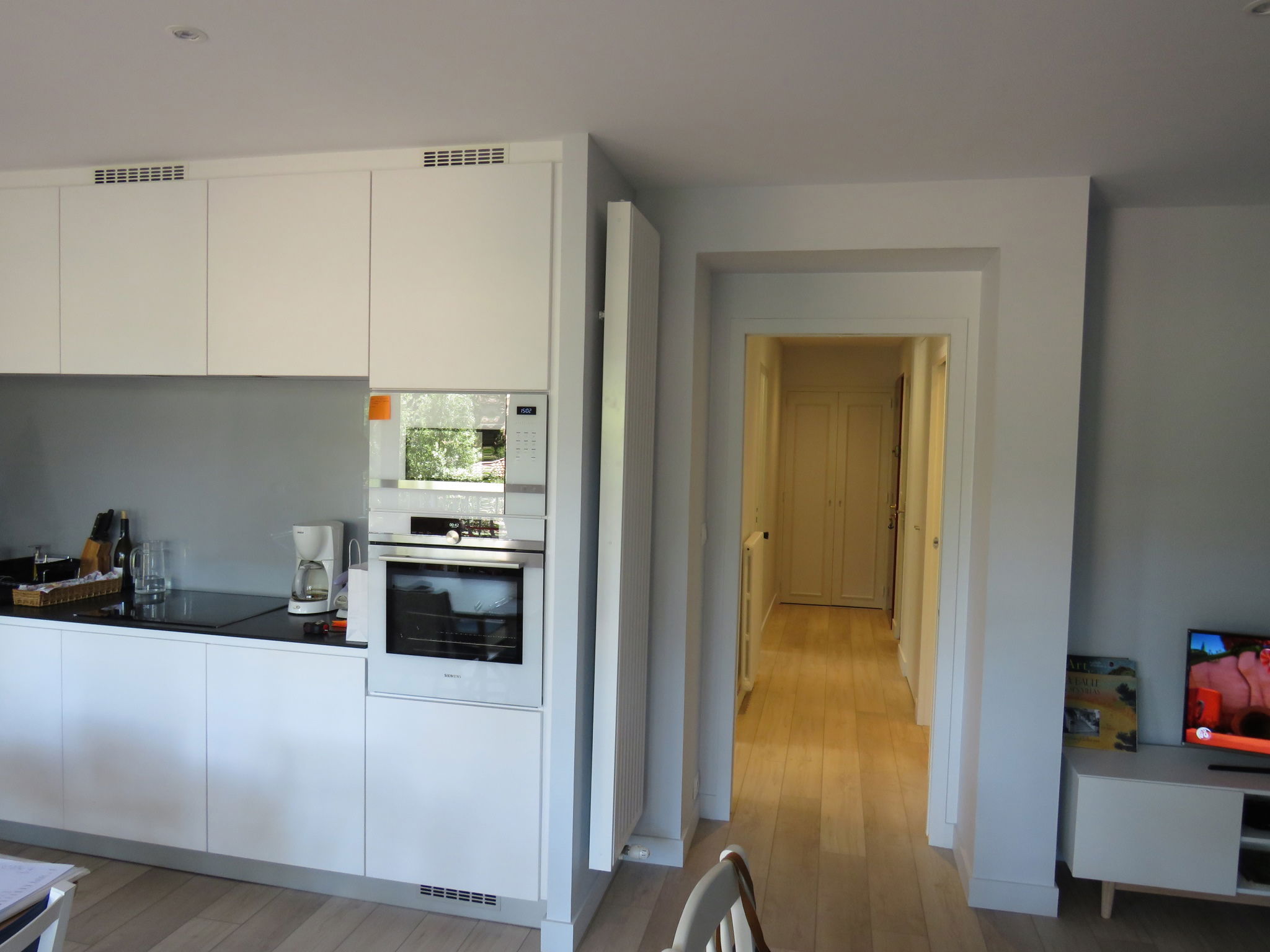 Schönes Wohnzimmer mit offener Einbauküche (nicht ausziehbares Sofa, Induktionskochfeld, Kühl-/Gefrierschrank, Mikrowelle, Backofen, Dunstabzugshaube, Geschirrspüler), die auf eine schöne Terrasse führt (elektrischer Grill + Gartenmöbel), ein erstes Schlafzimmer (1 Bett 160x190 cm), ein zweites Schlafzimmer (ausziehbares Sofa 160x200 cm), ein Duschbad (Waschmaschine - Wäschetrockner) und ein separates WC.